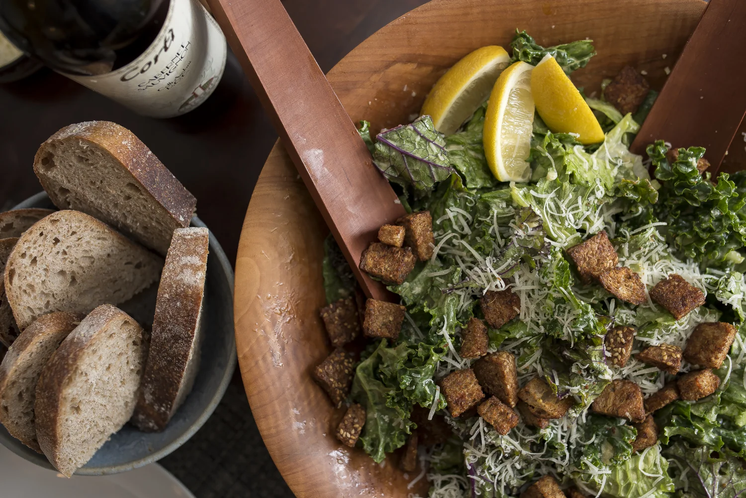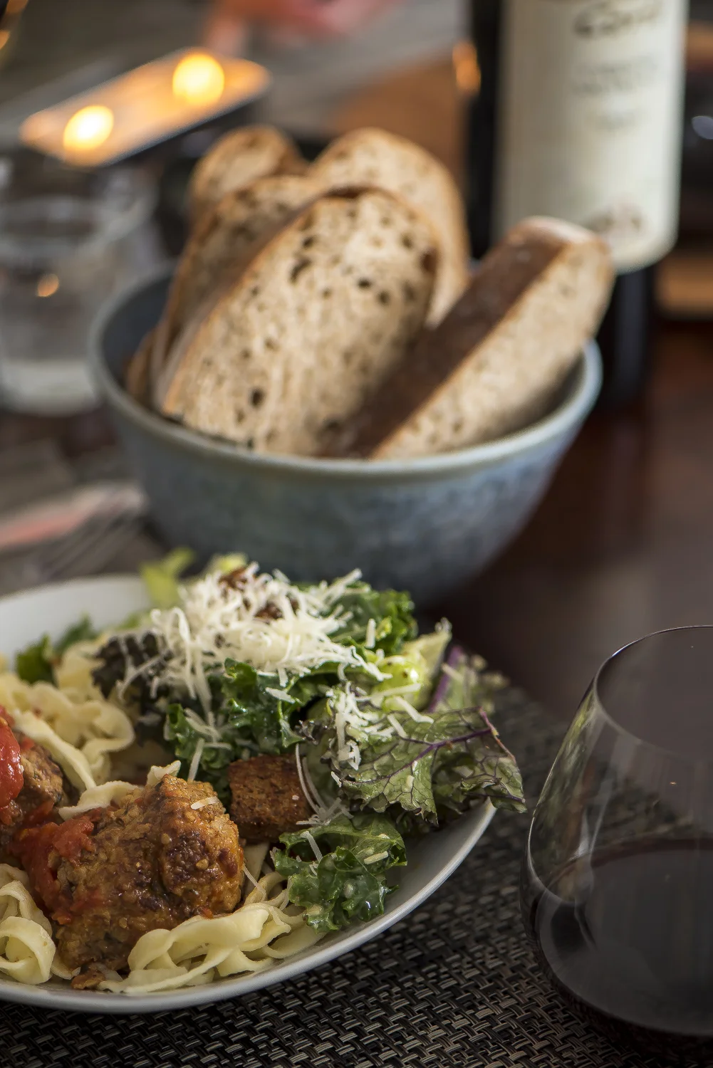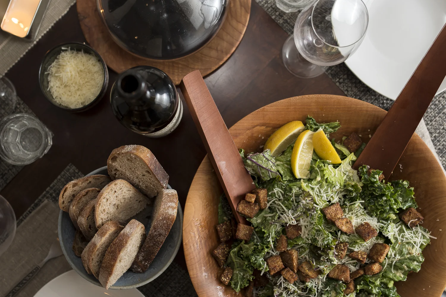 My good friend Alanna has a tradition of making spaghetti and meatballs on New Years Day, and since we’ve begun to stay in Vancouver for the holidays we’ve joined in this celebration. This is about spending time with friends and enjoying comforting, slow cooked Italian food – made entirely from scratch. Pictured below is our scrumptious meal from January 1, 2016 that featured homemade pasta, this fresh baked bread, A16 Cookbook’s Monday Night Meatballs and today’s recipe – classic Caesar salad.
