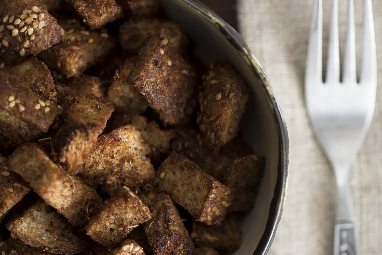 To prepare, slice bread into ¾-inch cubes. Place in a bowl and toss with extra virgin olive oil, herbs and spices of your choosing, and a dash of sea salt.