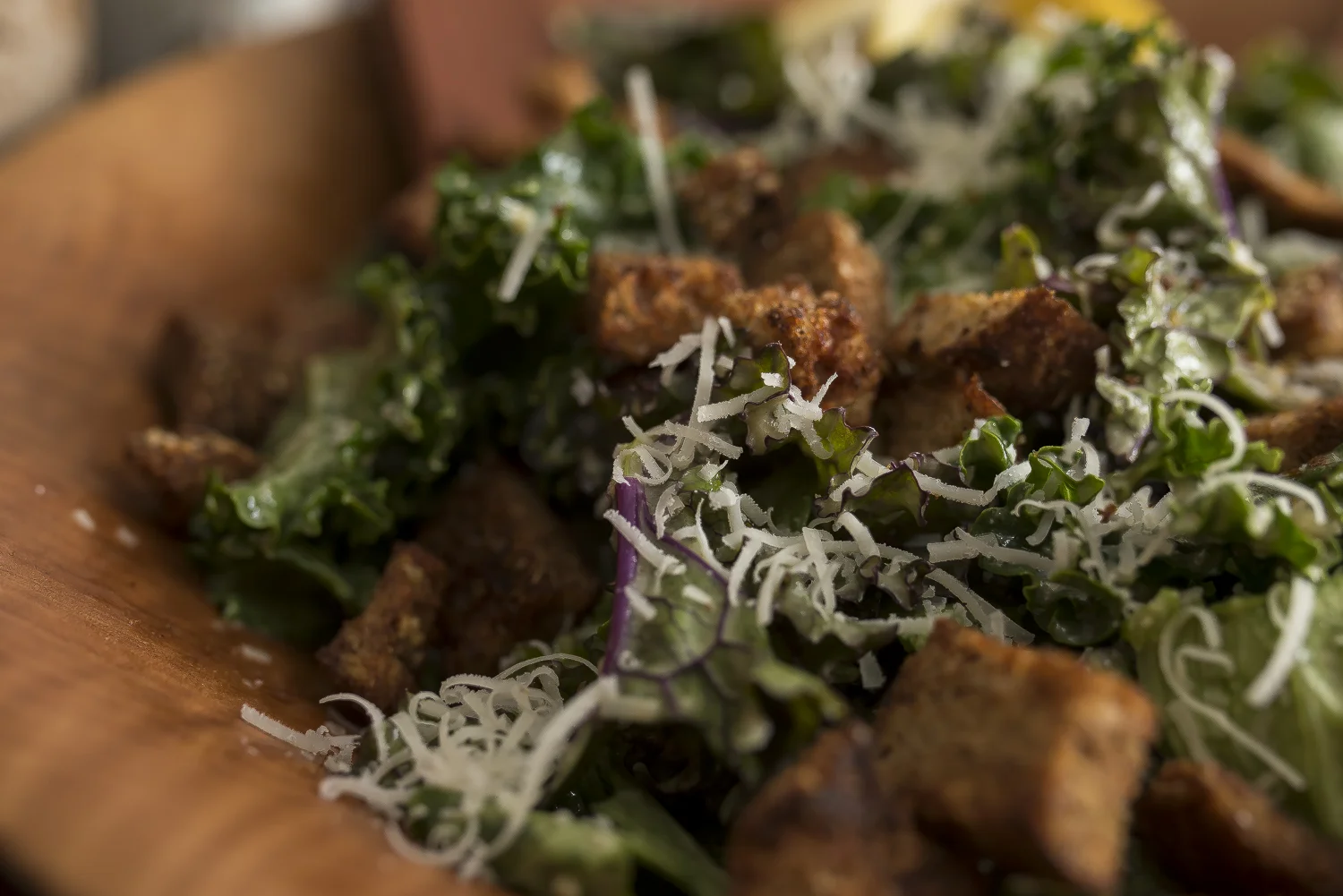 Just before serving, toss in greens to your preferred dressing to salad ratio. Sprinkle with reserved Parmesan and enjoy. If using kale, the salad can stand to be tossed 10 minutes or so before serving, which allows the acid in the dressing to tenderize the kale.