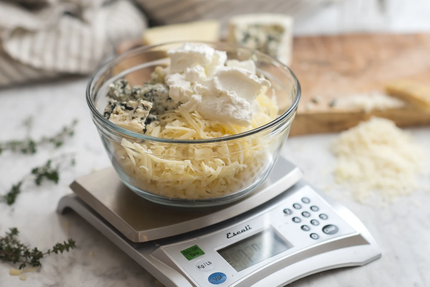 2 tsp fresh thyme, or ½ tsp dried *For the cheese you can use any combination you like. In general, I end up doing a bit more than a pound, divided roughly as: 6 oz sharp cheddar, jack, Gouda or combination thereof; 4 oz blue (your choice, a classic Danish blue or stilton works well); 6 oz Gruyere or emmental (or other good melting cheese); 4-6 oz fresh goat cheese (chévre). This is a great way to use up small odds and ends, if you keep as much cheese around as we do…