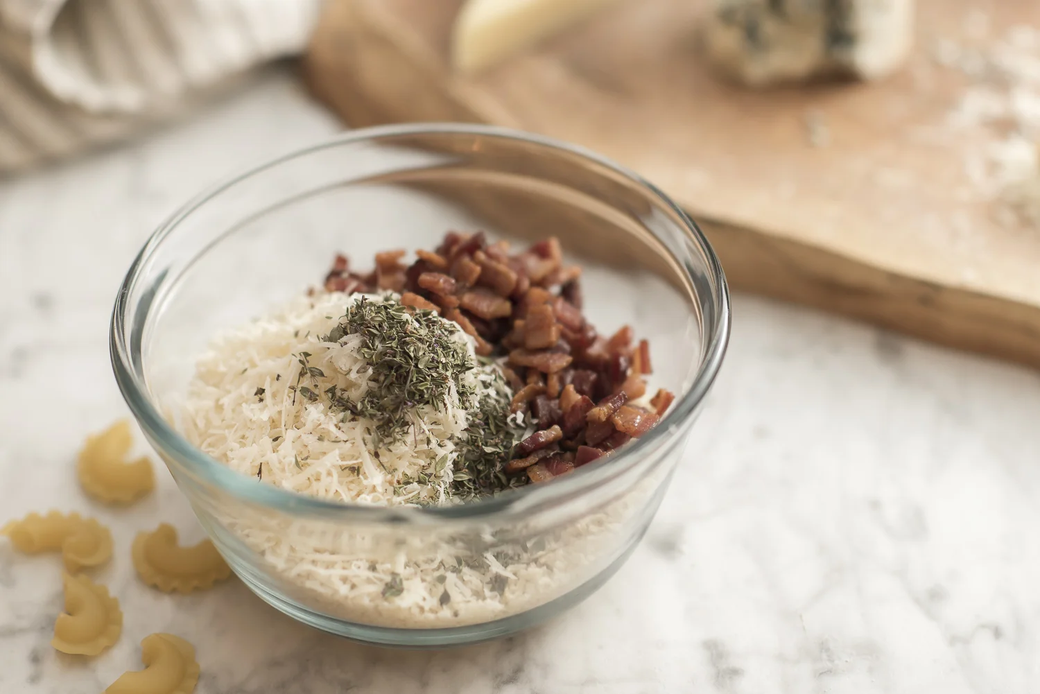 The recipe below is made from scratch, and baked. The original recipe (I say recipe loosely) was made using a box of President’s Choice Deluxe White Cheddar Macaroni and Cheese, and was served straight up, unbaked. Giving credit where due, for a boxed macaroni product this is pretty flavourful, and free of orange dyes. We’d generally follow box instructions and then add every kind of cheese in our fridge which, being a cheese-loving family, was a lot. One of those cheeses though (and I stick by this today) always had to be a blue, or as we affectionately referred to it in our house: stinky cheese. Trust me, even if you think you don’t like blue cheese it is absolutely essential to bringing out the sharp cheese flavour in the completed dish. And the stinkier, the better.