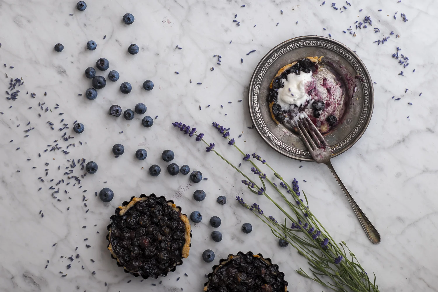 Once the 8 pieces of dough have been formed, sprinkle a quarter teaspoon of lavender blossoms in the bottom of each dough round. Fill the tarts with half a cup, each, of the blueberry filling. The tarts should be slightly heaping with the filling. Top each tart with a few small dollops of butter and place in the pre-heated oven for 12 minutes.